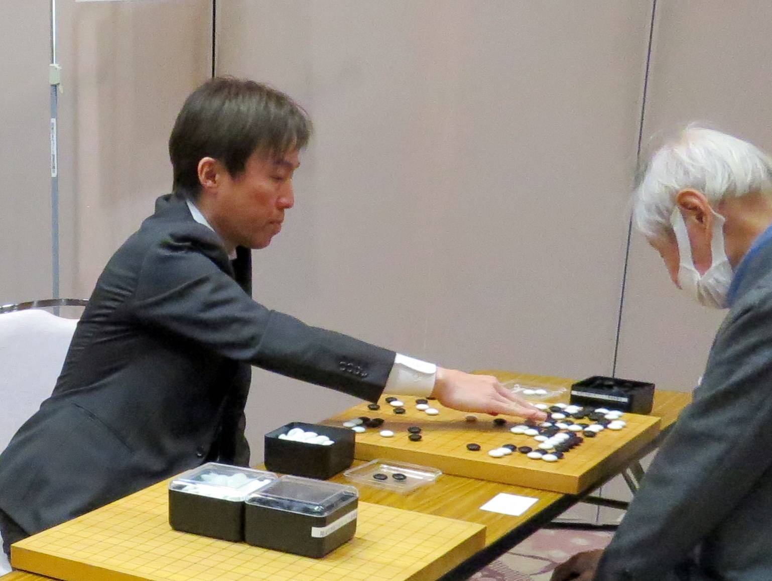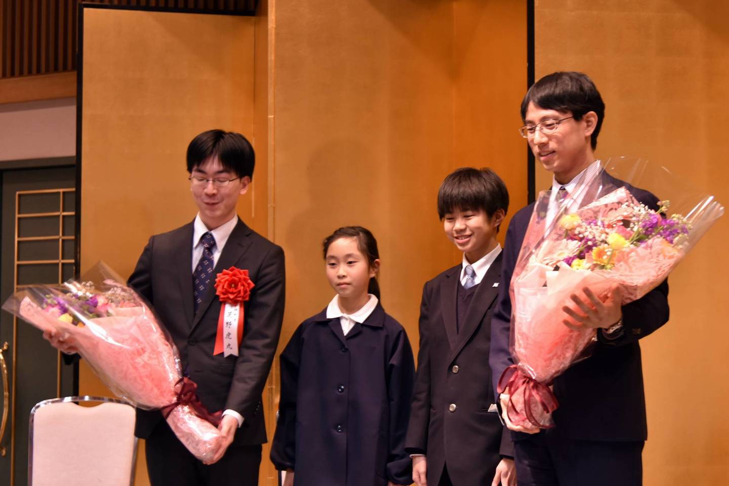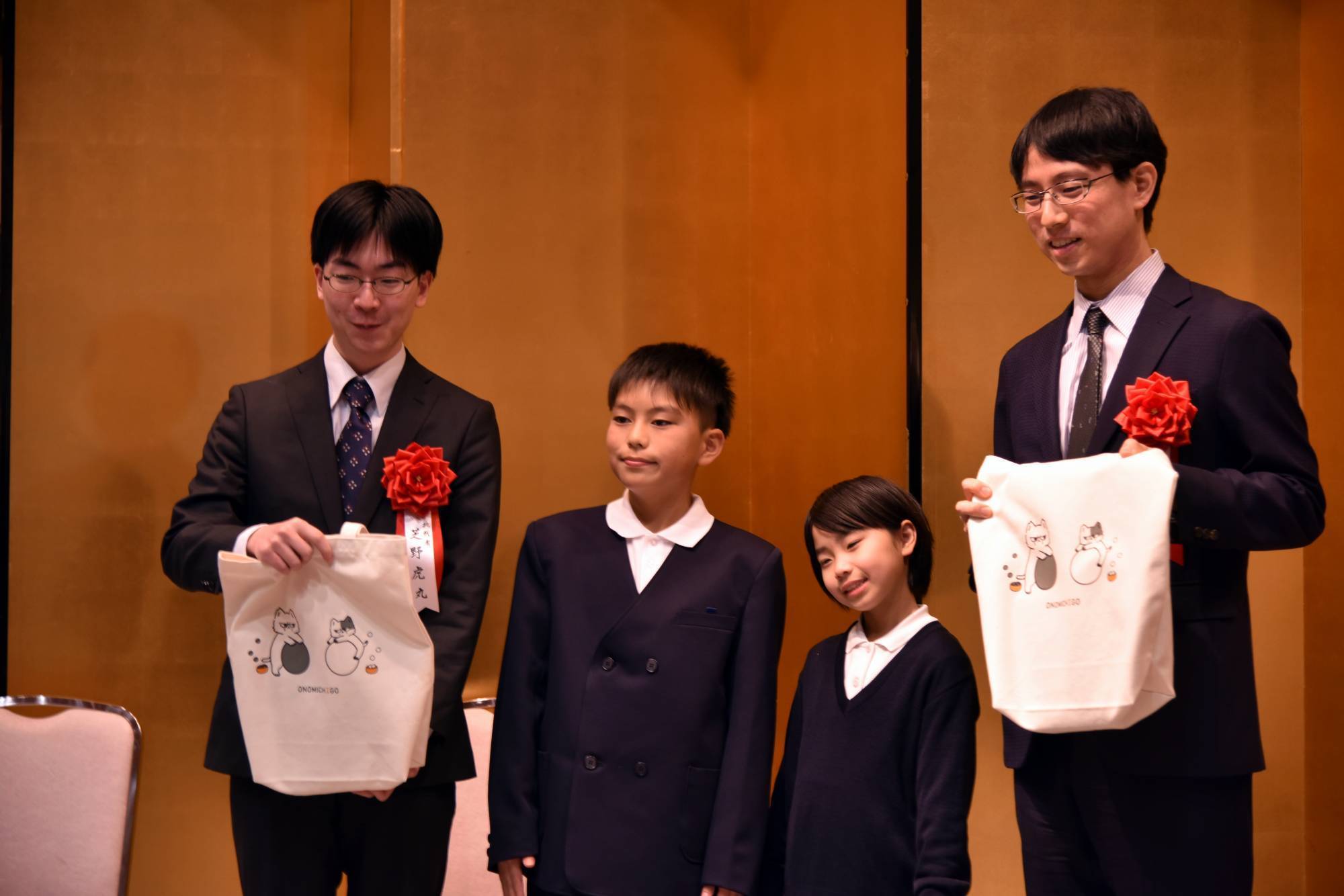 尾道市内の囲碁教室に通う児童から両棋士に花束と対局記念品の「おのみちGOトートバッグ」が贈呈されました。