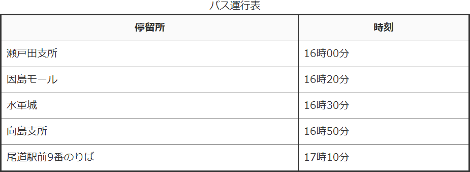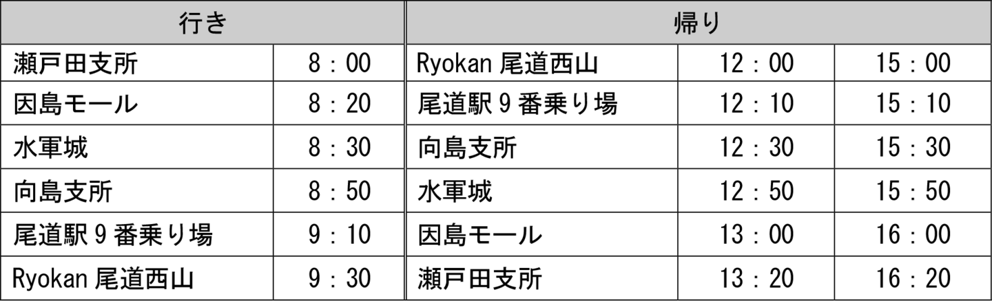 - また、停留所「組合会館前」からRyokan尾道西山まで、下記の時刻で無料送迎バスを運行いたします。
